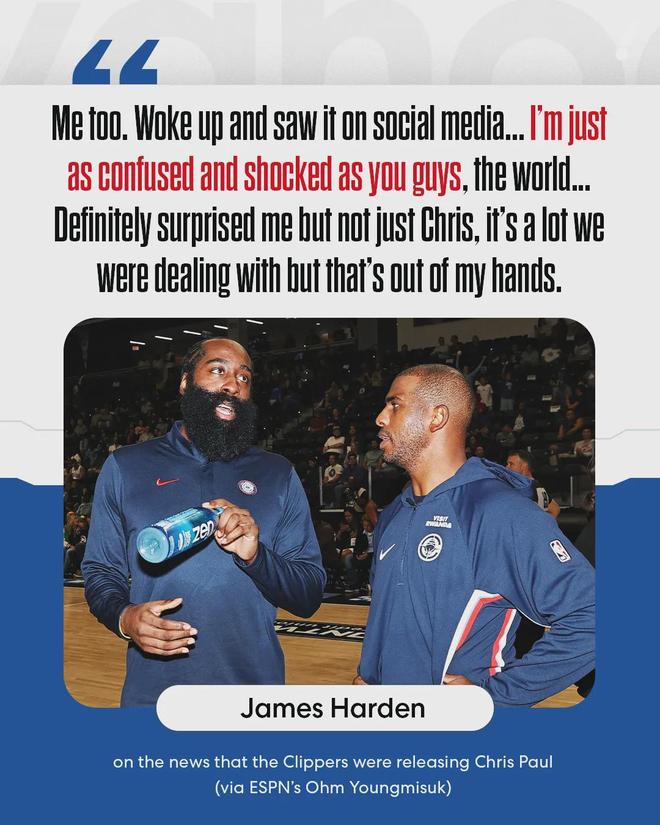 伦纳德表示自己跟哈登一样,是第二天早上从社交媒体得知保罗离队的消息。哈登说:“我睡醒之后才在网上看到这则消息,我和你们一样困惑与震惊。问题绝不只是保罗一人,最近我们要应对的变故太多了,这些都超出了我的掌控。”