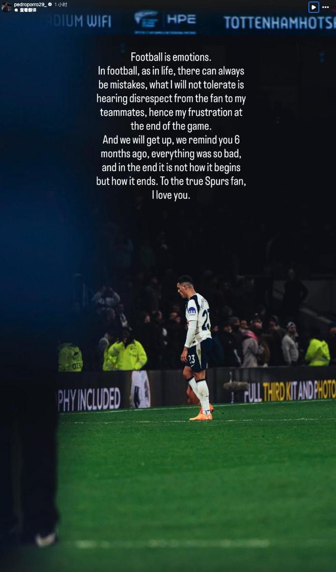 今日,波罗写道:“足球就是情绪。在足球中,就像在人生中一样,总会有失误,但我不能容忍的是听到球迷对我队友的不尊重,这也是我在比赛结束时感到沮丧的原因。我们会重新站起来。还记得六个月前吗?一切都那么糟糕,但最终重要的不是如何开始,而是如何结束。献给真正的热刺球迷们——我爱你们。”