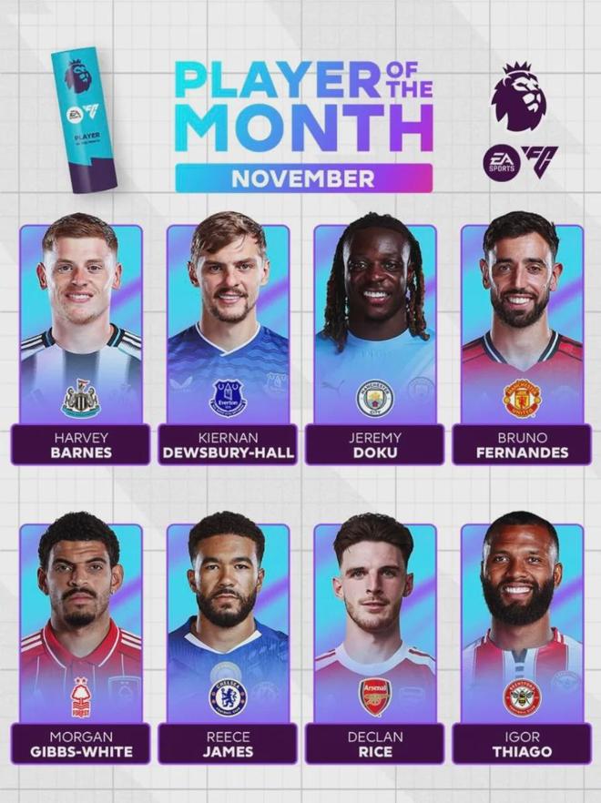 赖斯被提名为了英超11月最佳球员候选。