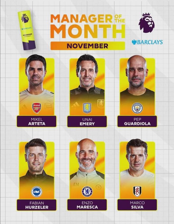 官方:阿尔特塔被提名为了英超11月最佳主帅候选。
