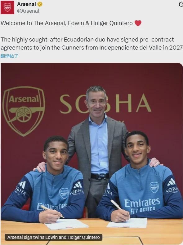 官方:阿森纳宣布和厄瓜多尔球队山谷独立就16岁双胞胎兄弟埃德温-金特罗和霍尔格-金特罗的转会达成了协议,2人将在2027年夏天年满18周岁后正式加盟。