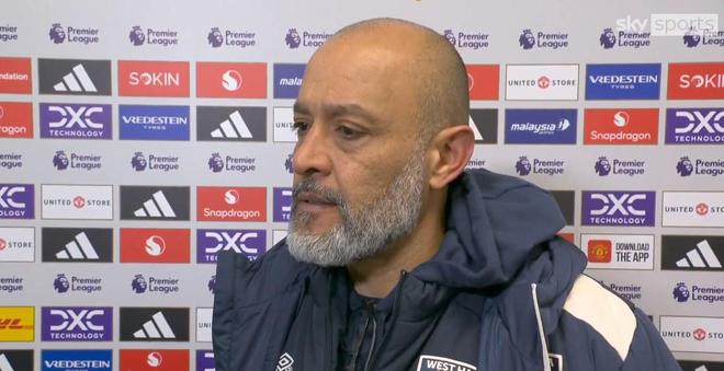 北京时间12月5日,在英超第14轮的比赛中,西汉姆联客场1-1战平曼联,赛后铁锤帮的主帅努诺接受天空体育的采访。