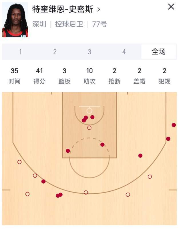 史密斯首发打了35分钟,18投11中,命中率61.1%,其中三分球11投5中,命中率45.5%,罚球16罚14中,命中率87.5%,砍下41分。而这是CBA俱乐部杯赛开赛之后,得分最高的存在了,不得不说,这史密斯的得分能力是真强。