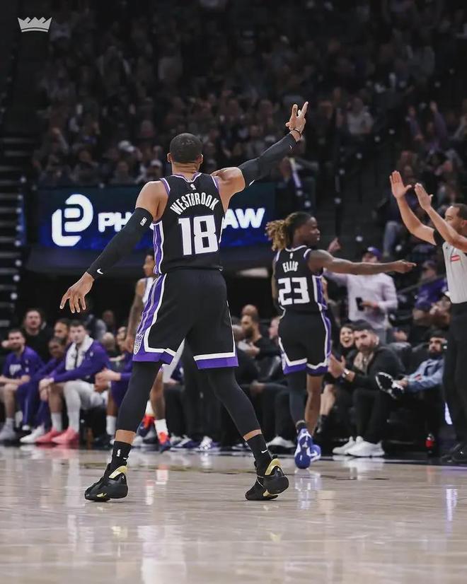 本赛季当威少首发时,他场均能得到15分7.9篮板7.9助攻1.6抢断。本赛季只有3名球员能做到首发场均15+7+7,且场均至少命中2记三分。除了威少之外,另外两人是东契奇和约基奇。拿着底薪的威少,打着打着成了国王核心球员。