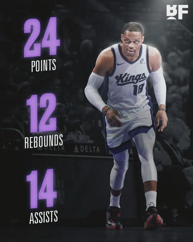 北京时间12月9日,NBA常规赛:国王客场105-116不敌步行者。国王后卫威斯布鲁克表现出色,首发出战40分钟,投篮16中10,三分3中2,罚球4中2,砍下24分13篮板14助攻2抢断1盖帽3失误,正负值-7。末节威少连砍7分1助攻!